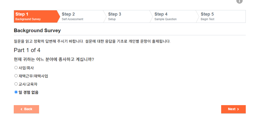 앞서 설문조사에서 고른 답변을 바탕으로 주제별 문제가 주어집니다. 이때 문제는 현재와 관련된 질문, 과거와 관련되 질문, 그리고 경험을 묻는 문제를 고루 출제합니다.