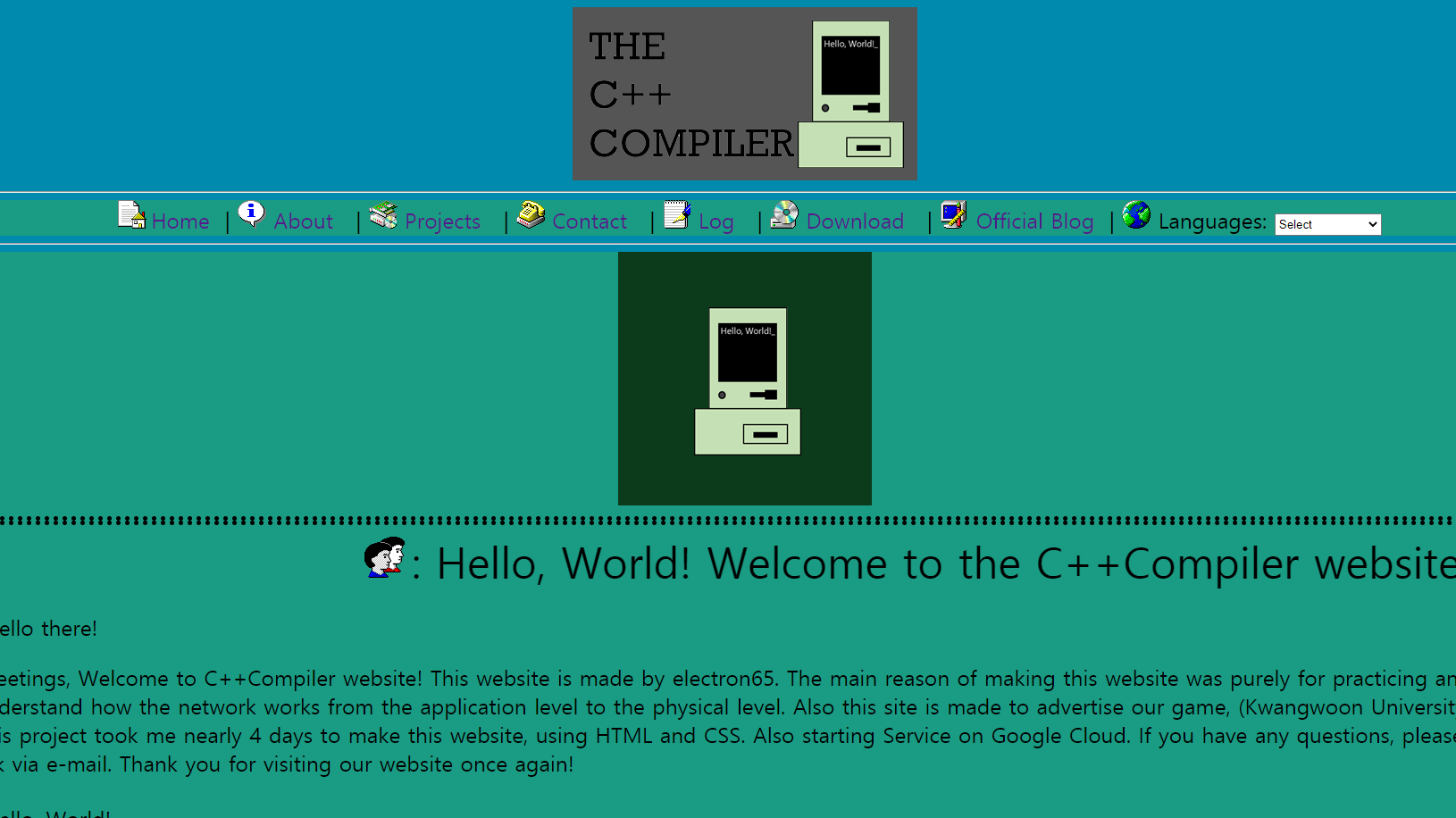 무작정 따라하고 만든 것이 위의 사진이었다. 몇 줄 안 되는 코드였지만, html하나로 90년대 느낌 나는 사이트를 만들자는 생각을 하고, 어릴 적 경험을 되살리며 최대한 똑같이 만들려고 하였다. 위의 사진을 기반으로 사이트 개발에 착수하고 1주일이 지나 영어 버전의 사이트가 완성되었다. 원래 영어 사이트만 개발을 하려고 하였으나 하는 김에 한글 사이트도 만들자는 생각에, 영어 사이트를 1주일간 확장하여 한글 사이트까지 만들게 되었다. 이제 사이트 개발은 다하였으나, 정작 호스팅 할 서버를 찾지 못했다. 여러 가지 고민이 있었으나, 미래에 혹시라도 JavaScript를 할 경우가 생길 것을 감안하여 구글에 호스팅을 하였다. 구글 호스팅을 하면 dynamic 한 JavaScript도 지원하기 때문에 미리 연습할 겸 호스팅을