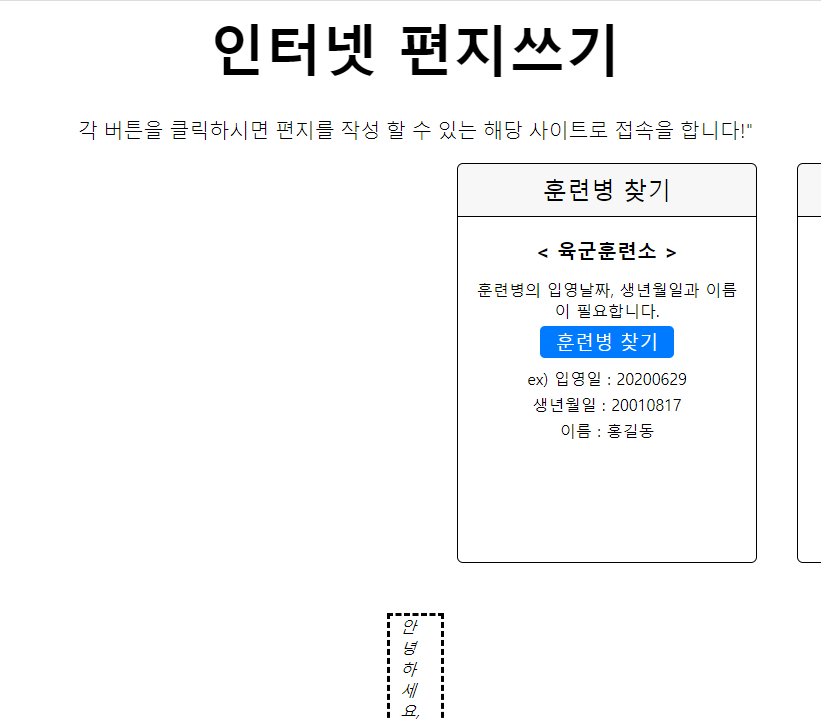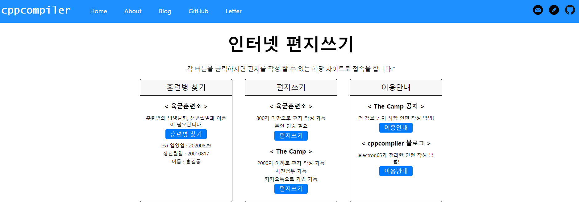 사실 첫 호스팅 이후, 사이트 하나 제작하는데 너무 힘들어서 앞으로 몇 년간 제작할 생각은 없었다. 그 와 중에 입영 영장이 나오면서 굉장히 좋은 아이디어가 떠올랐다. 훈련소에 편지 보내는 링크를 한 곳에 모아 두고, 나중에 혹시 편지를 써줄 일이 생기면 링크하나 만 배포 하면 된다는 생각에, cppcompiler에 추가할 예정이었다. 하지만 cppcompiler를 좀 지난 관점에서 보니, 코드면에서 너무 비효율적으로 작성하였으며, 그 당시 html과 css를 구별하지 못해서 모두 html에 같이 작성하는 바람에 재작성할 필요성을 느꼈다. 이에 사이트 화면을 부분적으로 나누어 프로그램을 작성하여 만들면 좋겠다는 생각이 들어서 구글링 하며 모듈별로 html과 css를 작성하여 나름대로 최적화를 하여 개발을 하였다. 하지만 겉보기에 잘 만든 것처럼 만들었지만, 작은 화면에서는 깨지는 현상이 발생하였다. 이에 나름 3일 투자하며 문제를 해결하려고 하였으나, 근본적으로 html과 css를 공부한 적이 없던 터라 한계점에 도달하였고 큰 화면만 지원하게 되었다. 이전에 구글에 호스팅 하여 1년 후에 계약이 만료될 예정이었지만, GitHub에서 static 한 웹사이트를 무료로 만들 수 있다고 하여, 2차 개발과정에서 호스팅 회사를 옮겼다.