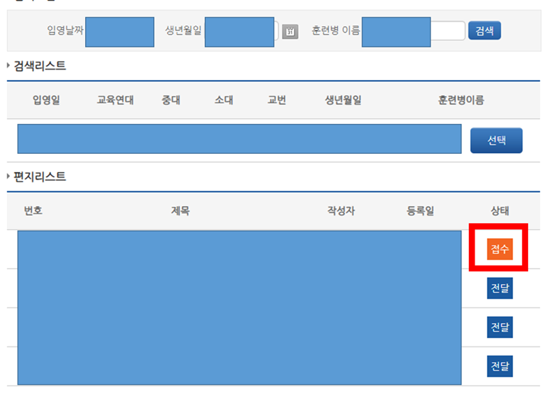 훈련병을 다시 검색하면 보낸 편지가 "접수" 상태임을 확인 할 수 있다. 편지의 내용을 다시 확인 하고 싶으면, 제목을 눌러 편지 보낼 당시에 설정한 비밀번호를 입력하면 열람이 가능하다.