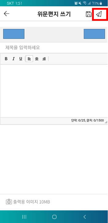 편지를 작성한다. 다 작성하면, 오른쪽 상단 "종이 비행기 모양"을 누른다.