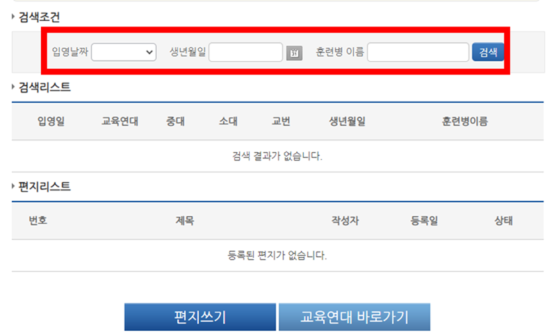 찾고자 하는 훈련병의 "입영날짜", "생년월일" 과 "이름"을 입력하여 검색한다.