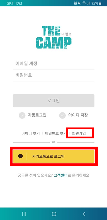 더 캠프를 가입 하는 방법은 2가지 이지만, 카카오톡 계정이 이미 있다면 카카오톡으로 가입하는 것이 편하다.