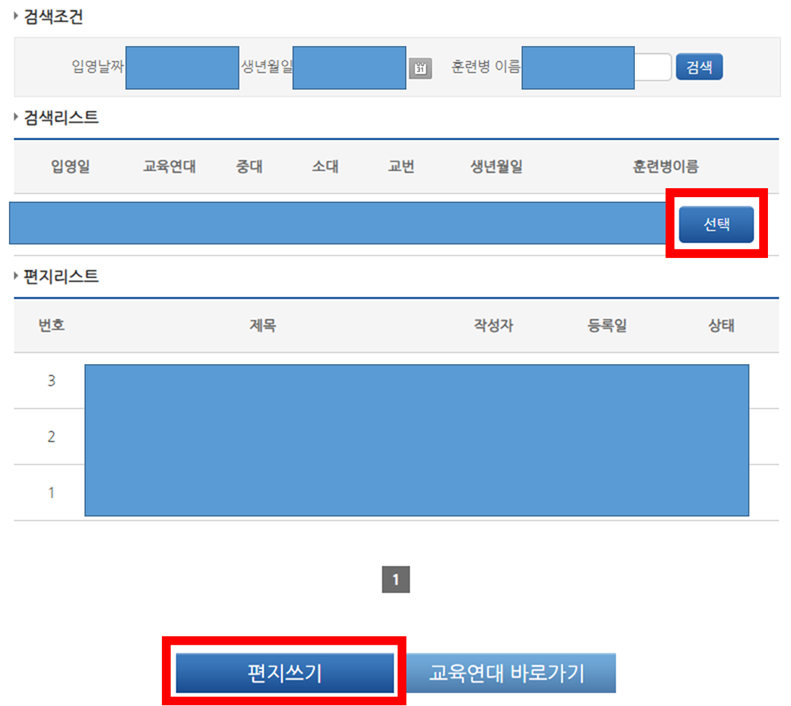 편지를 작성하고자 하는 훈련병을 선택 한 후, "편지쓰기"를 누른다.